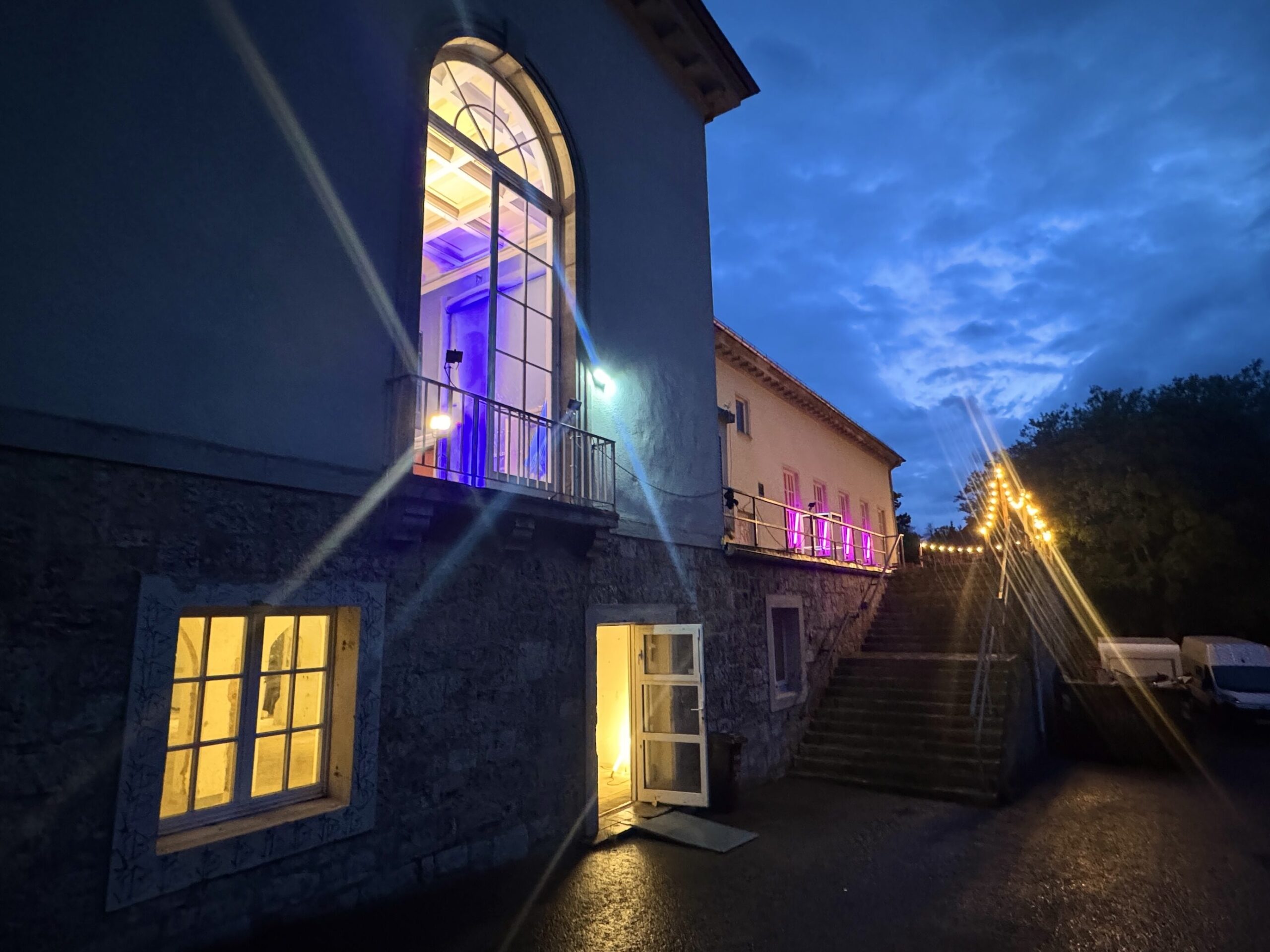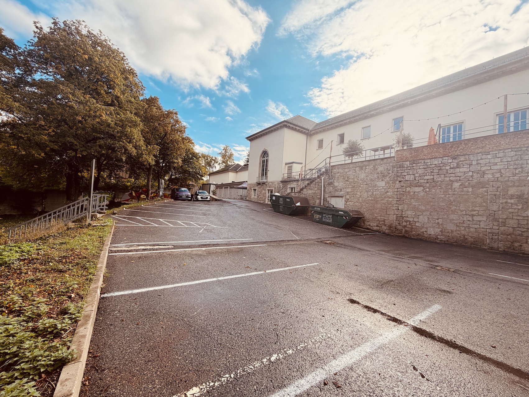 Der Hof kann von der Humboldtstraße mit PKW und LKW befahren werden. Es gibt 15 PKW-Stellplätze. Vom Hof aus ist die Terrasse – und somit der Zugang zum Foyersaal – über eine große Freitreppe direkt erreichbar. Das Kreuzgewölbe ist von hier aus barrierefrei zugänglich. Im Außenbereich befinden sich vier beheizbare Toiletten mit Handwaschbecken.