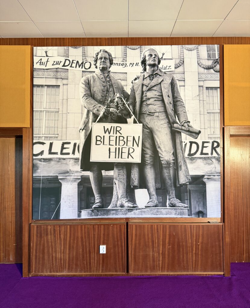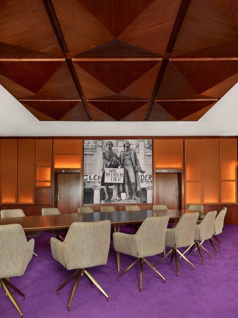 Dieser Saal liegt im 1. Obergeschoss und ist nur über ein Treppenhaus erreichbar. Er wurde 1985 eingerichtet und ist im Originalzustand erhalten. Seinen Namen „Das NEUE FORUM“ erhielt er, weil im Wendejahr 1989 die Mehrheit der Redakteure des Funkhauses entschied, über die Oppositionsarbeit der DDR zu berichten. Ein Vorgang, den es in der DDR so zuvor nie gegeben hatte: Es war eine der ersten basisdemokratischen Entscheidungen im sozialistischen Medienbereich und damit der Wendepunkt in diesem Gebäude. Der Raum wurde behutsam von Müll befreit. Am ovalen Konferenztisch finden 26 Gäste Platz.